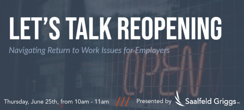 Join us on Thursday, June 25th at 10am as we discuss these topics and address some questions around Phase 2 Re-openings and related COVID-19 legislation. If you have questions about attending this webinar, email Courtney at cbloedorn@sglaw.com.
